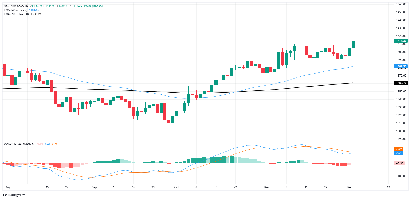 韩国国会在尹锡悦总统宣布戒严令数小时后介入,严词拒绝了韩国总统的戒严要求。韩元小幅企稳,在周二早盘飙升至 1445.00 点后,收复了当天的跌幅,美元/韩元报收于 1420.00 点附近。